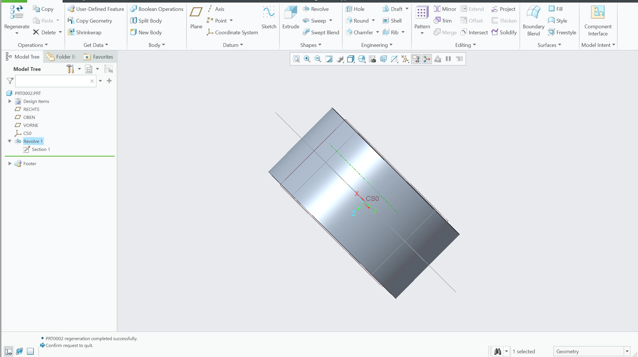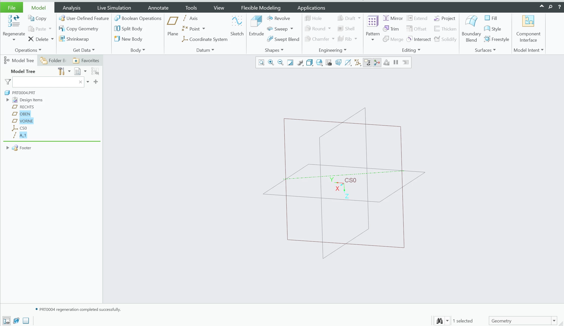I am having an issue where when I create an axis, it does not appear to be in the correct position and is in fact in a wild poisition. For example, I create a new sketch, select two of the coordinate planes (Front and Right for example) and then click "Axis". You would expect this axis to show up as a line intersecting the intersection points of the two planes. However, what shows up has no visible relation to the two selected planes. See "creo pic 4".