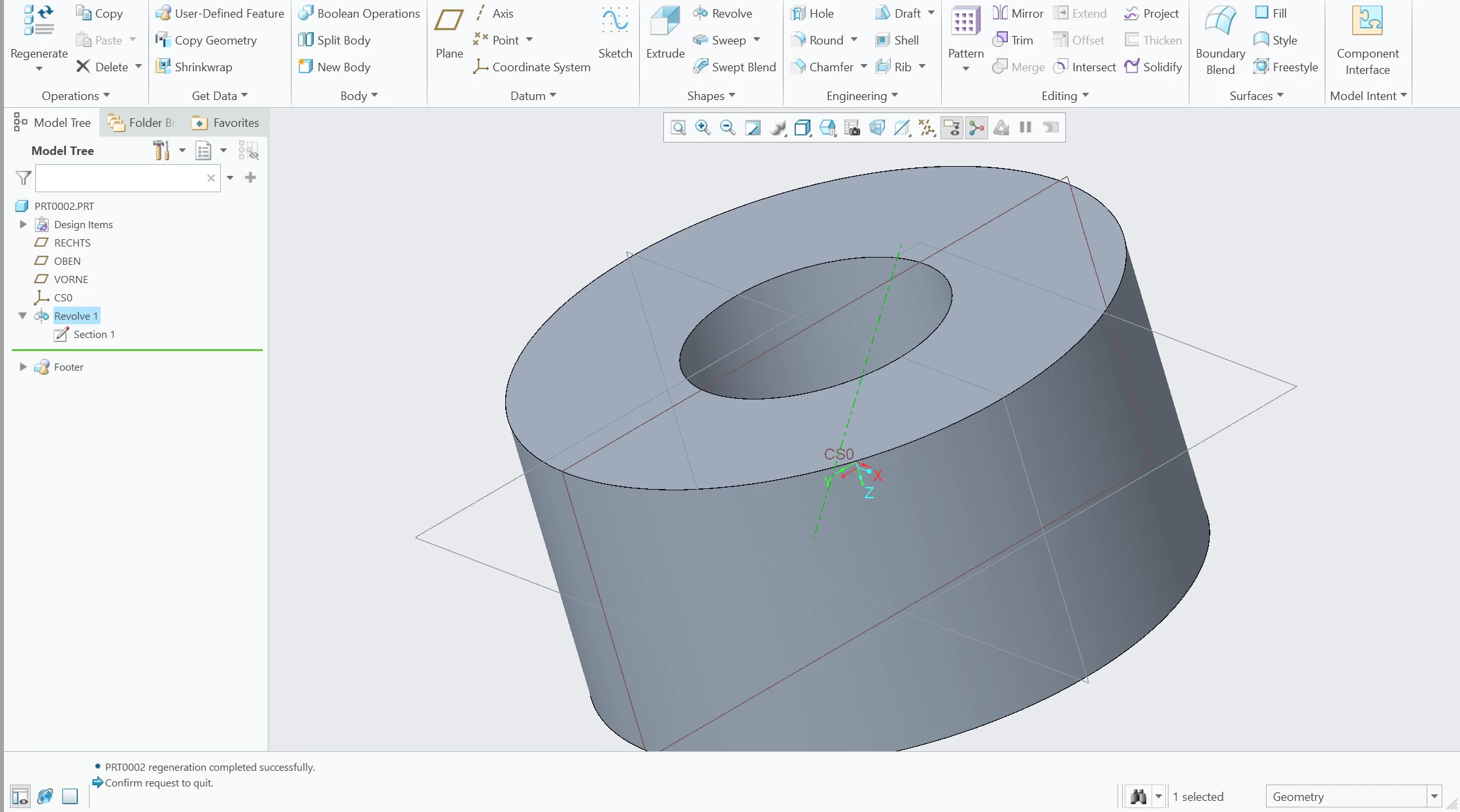 Another example is when I use "revolve". I create a sketch with an axis and a shape (square in the picture) and the revolve works perfectly, but the axis of revolution is totally wrong and shifts as I pan/zoom around creo. See picture 1 and 2.