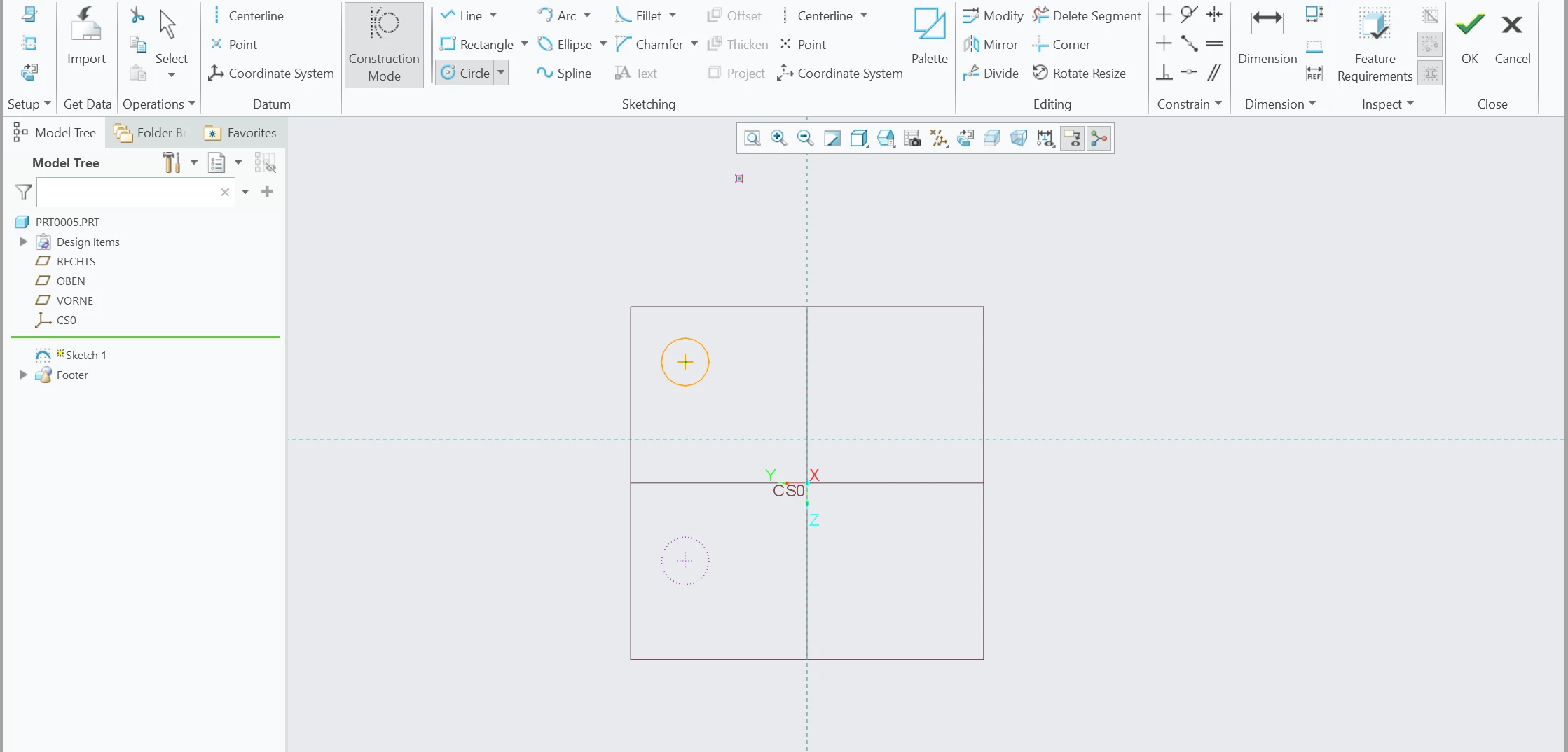 The last example is when using construction lines in a sketch. The construction shapes appear in totally different places from where I place them. See picture 3. In this example, I placed the construction circle in the exact same location as the "real" circle, but it shows up in a totally random place. I belive this has something to do with the blue-dotted lines on the sketch, which for me are not alligned with the principle planes (as they should be based on others experience).
