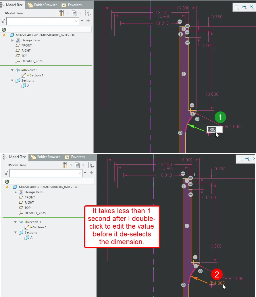 We are currently using Creo 8.0.2.0, and when I double-click on a dimension to enter or edit the value, the prompt comes up and then immediately disappears (see attached images). I have less than one second to try and enter a new value.