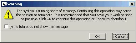Pls help me fix this problem. I have received warning When I export data to Adobe Acrobat or AutoCAD: "The system is running short of memory. Continuing this operation may cause the session to terminal. It is recommended that you save you work as soon as posible. Click OK to continue this operation or Cancel to abandon it" Thanks.