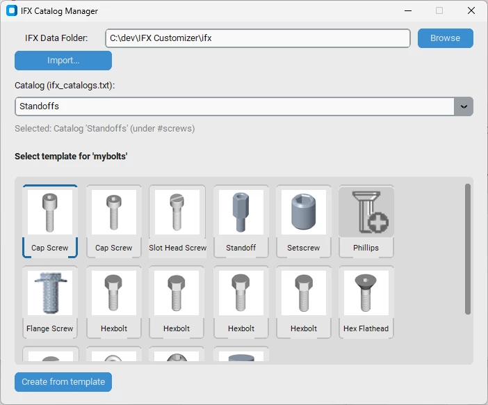 I created this desktop application for managing IFX fastener catalogs. Create new catalogs, add fasteners from templates, and append data rows to existing fastener files. You can also import premade fastener catalogs from McMaster Carr.