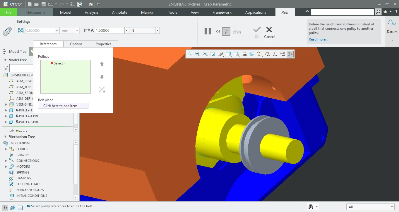 Hi, I was trying to add a belt mechanism in creo. But I cannot seem to select references for the pulley. Please help. I cannot select any surface or edge for the references. I have also tried selecting a belt plane. Please help!