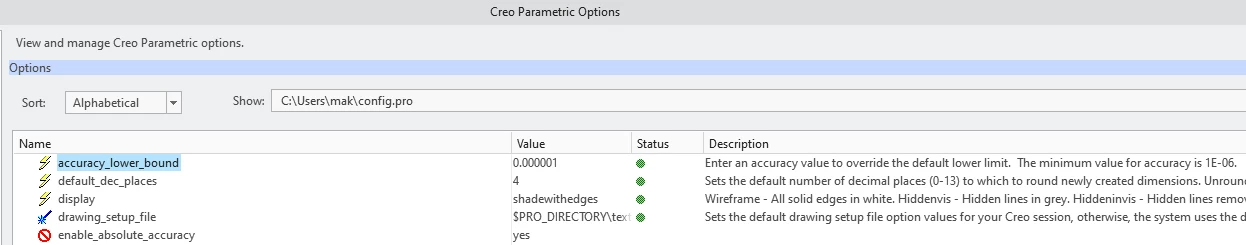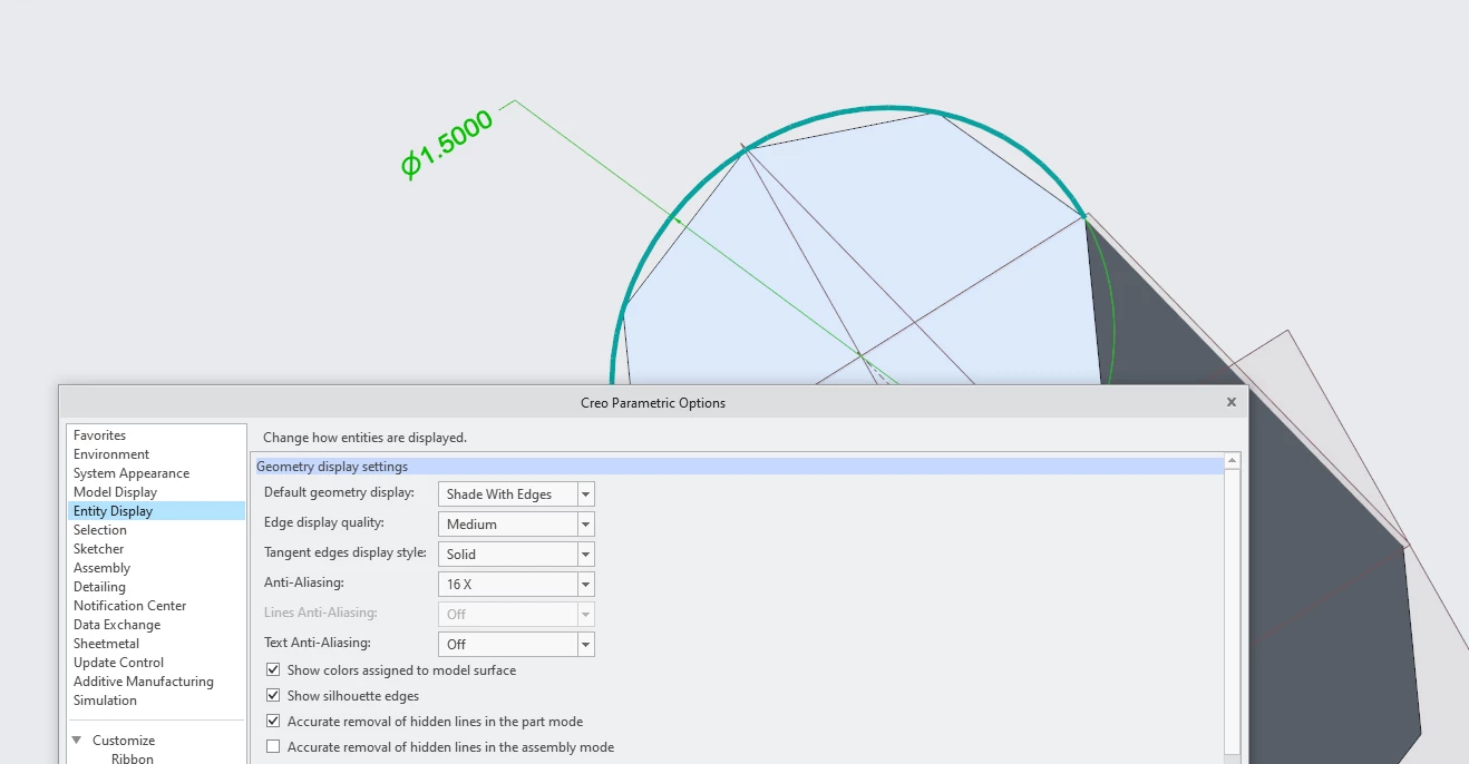 I am aware that default accuracy settings changed from Creo 6 to 7 (& 8). But whether or not these changes affected edge display quality is both unclear and without a way to fix it.