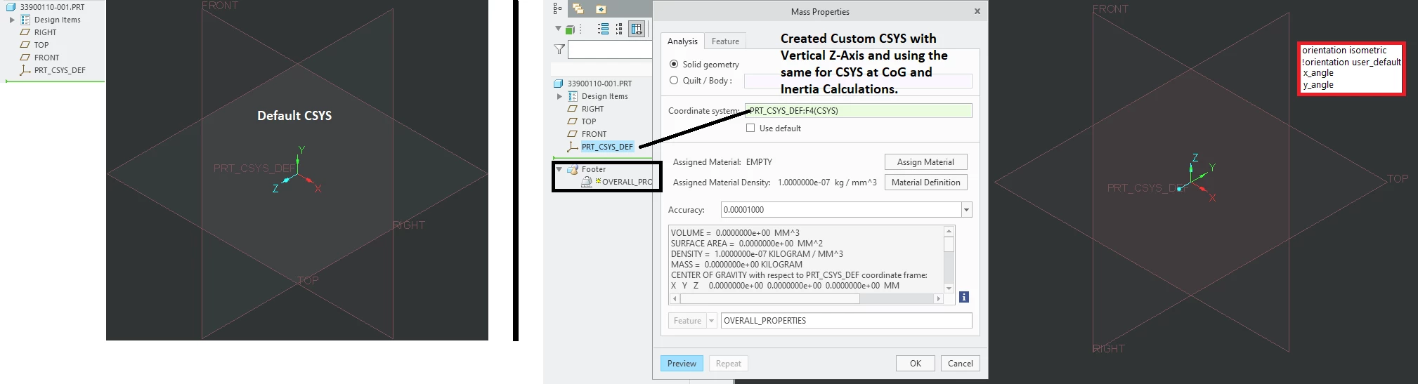 Right now using Config.Pro Option, Orientation set to Isometric. Also created a Custom CSYS with Vertical Z-Axis using the same to calculate CoG & Inertia and File Import operations.