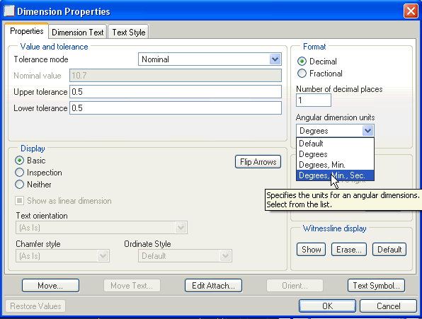 I'm trying to show 23±0.5 degrees as a limit dimension. So, I get [cid:image001.jpg@01CB4B52.D5B37320] when I have the decimal set to 1 place, but I don't want the trailing zero, so i set the decimal to zero and get[cid:image005.jpg@01CB4B52.D5B37320]. I can't seem to get it to show 30 minutes without having 1 decimal place.