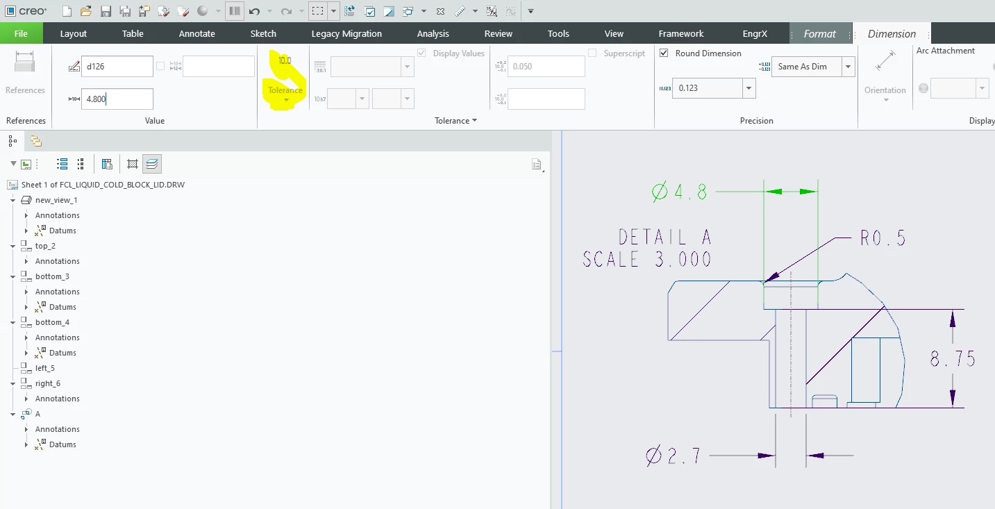In the part, can you see the tolerance on the dimension. If not, search your config.pro options for TOL_display and set it to yes. This is an overall option that controls all model and drawing tolerances.