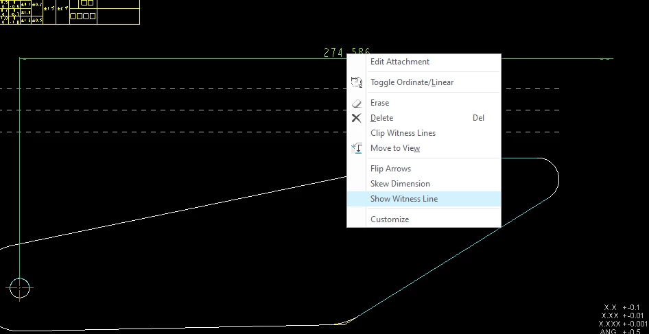 If the witness line has been erased or if the view is partial, select the dimension, RMB, select Show Witness Line and CREO will show it.