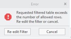 We are working on an assembly having lots of sublevels. While creating some relations , when try to "Insert" -> "From List" , it shows the error message "Requested filtered table exceeds the number of allowed rows.Re-edit the filter or cancel."