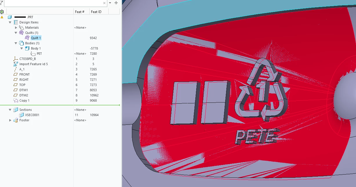 I have next to no surfacing experience. I have a solid part that has a concave curved indent, made up of individual "surfaces" I guess you would call them. Protruding from that set of surfaces is a recycle symbol that I need to edit, or, remove & replace. My initial intent was to remove it, then extrude a different one, both using the "up to" reference and the quilt being that ref. I selected the surrounding surfaces, then Copy & Pasted. That gave me the quilt fine, but I think there are "holes" in it where the recycle symbol is. I can't extrude to it from the front or back, it just fails. Help me out...? Something to fill the holes, or a different approach entirely? I am at my wits end.