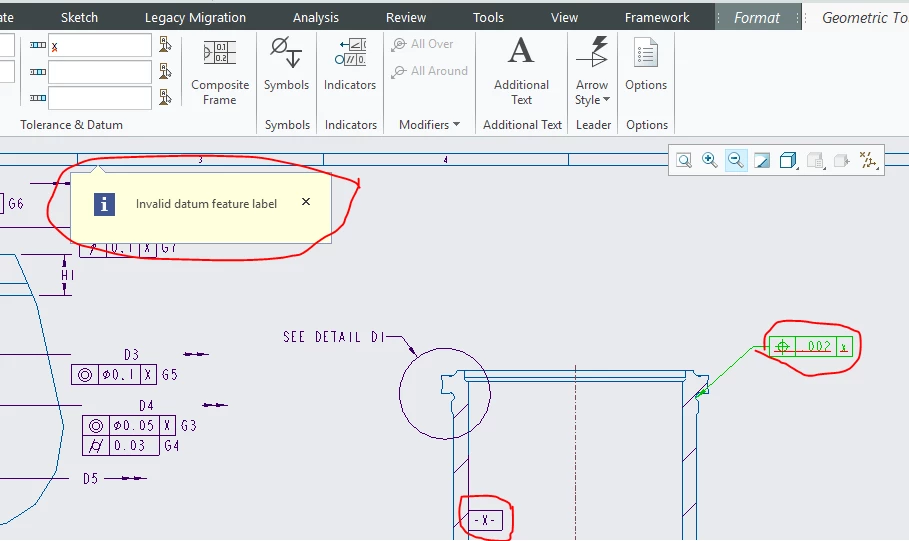1. I have already worked with Creo 2 and for GTol definition in the drawing what I did previously was changing the datum display type in the model (from the property of the datum and change display type). Then in drawing it was automatically displayed in datum selection tab (datum Refs) of GTol tool, but in Creo6, when I do the same procedure, it is not possible to select the datum feature and when the label of the datum is typed an error appears as shown in the attached figure (Invalid datum feature label)