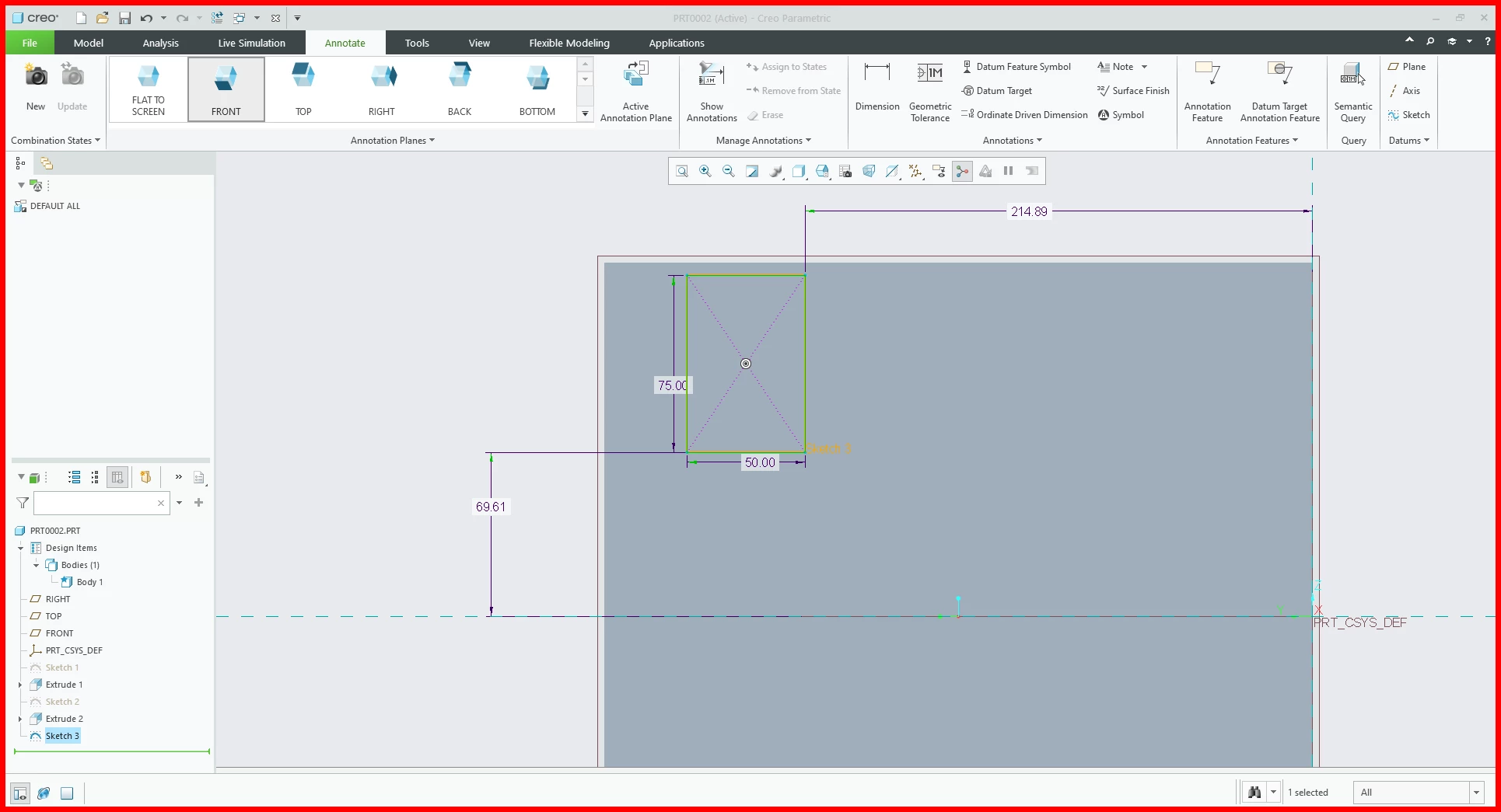 I've been encountering an issue with weak constraints, particularly dimensions that Creo automatically sets. For example, I have a weak dimension set at 69.61, and I'm having trouble deleting it. I wish to set this dimension to 5, measuring from the top gray edge to the top yellow line.