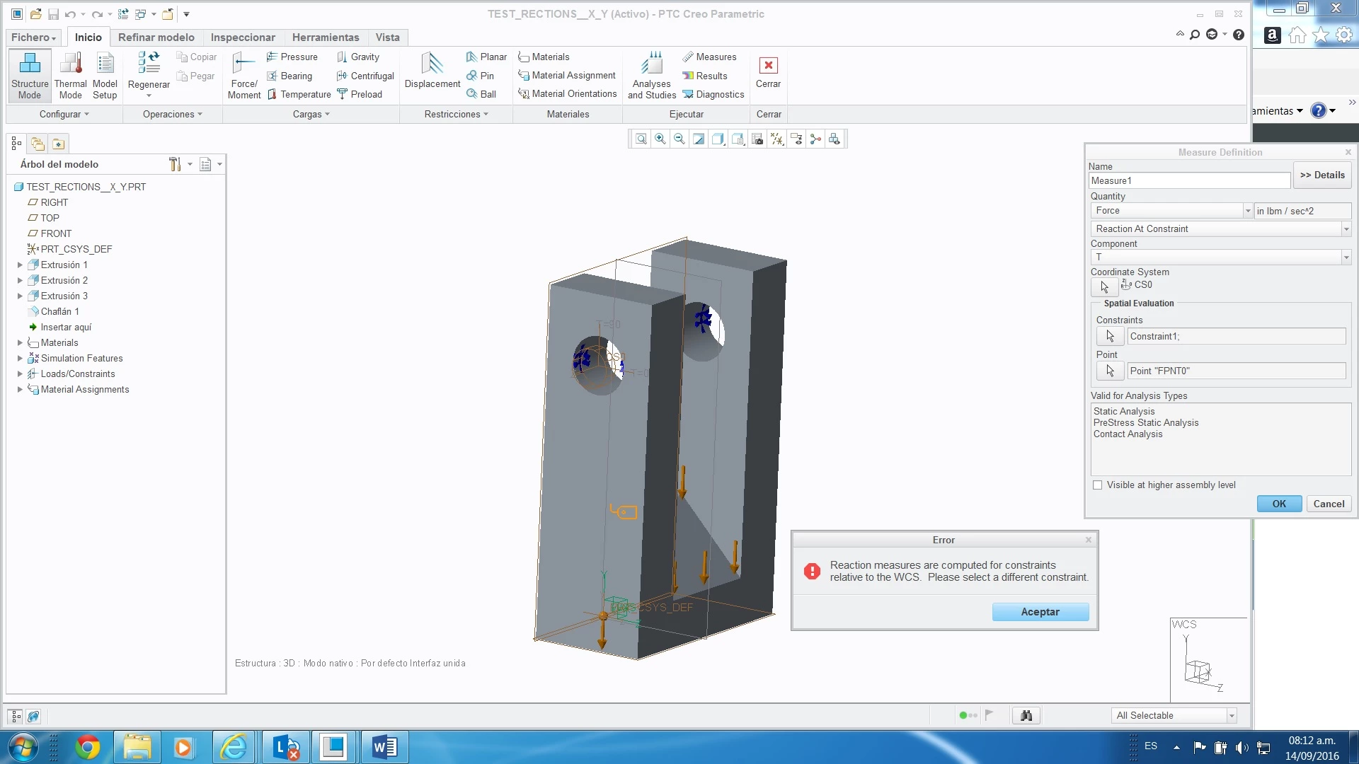 Now at the measures tab I can "measure" the resultant forcé at the constrain however if I try to "measure" any of the components x,y,z it gives me an error, it tells me reactions measures are computed for constrains relative to the WCS...please select a different constrain...