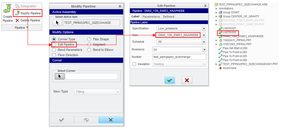 1 / Modify Pipeline => Edit Pipeline => Size => i choose the size i wanna move my tube to (DN40 in my case).