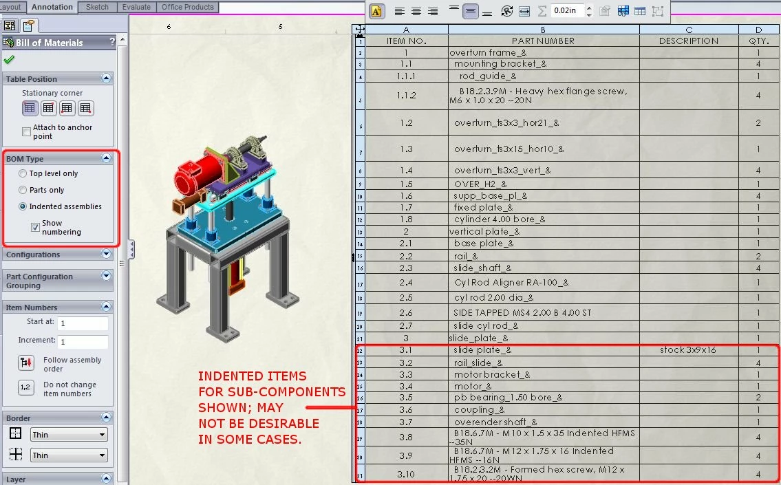 I am unable to create indented BOM in same as like Solidworks drawing (I have attached a Image). Please anyone suggest me, how can I get over this problem.