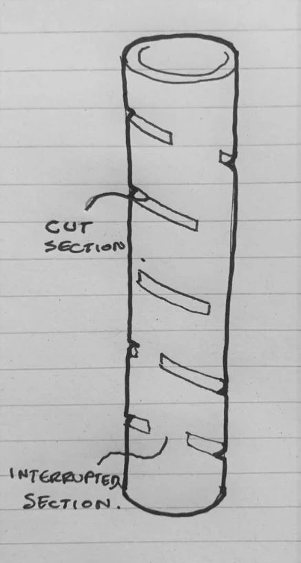 I am trying to add a helical cut to a tubular component such that the cut profile will only be applied to a defined amount of rotation (say 200°) and will then be interrupted such that no cut occurs for another defined amount of rotation (say 60°). This would mean that the swept cut would recommence at 260° for another 200° and stop again for another 60°, the pattern would repeat itself for whatever the defined length of the sweep is.