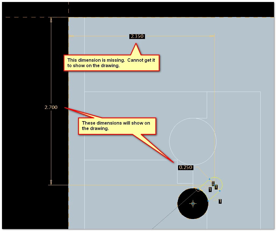 I ran across this today, I have a model with a sketch. The sketch has dimensions in it. When I try to show those dimensions on my drawing view, all the dimensions EXCEPT one appear. The dimension that wont show in drawing is not erased or deleted.