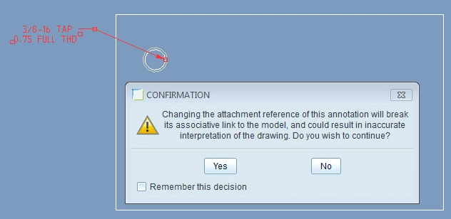 Does anyone know how to make a feature note with a leader behave like a dimension? Ultimately I would like to either change the attachment of the standard hole feature note, or create my own feature with its respective "Setup Note - Feature" placed to behave like a dimension (in the 3D model, not the drawing). This needs to be part of the feature, not a separate annotation set. Here are the things I've tried:
