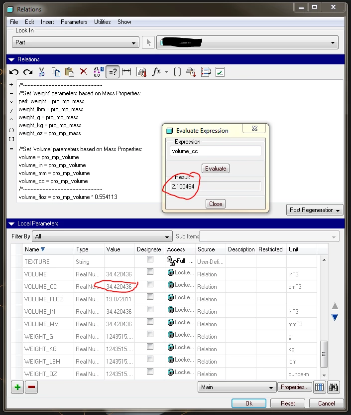 I'm using unit sensitive relations to drive several parameters so I can get volumes & weights in different units. It seems to work great but for one frustrating limitation. Regardless if I'm looking at the parameters in the relations dialog or the parameters dialog, the values displayed are usually incorrect. The values evaluate correctly, but they are displayed wrong. (see image below).