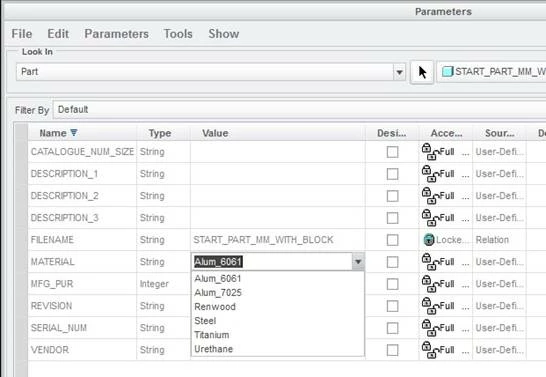 I know that I can assign a material, and the value PTC_MATERIAL_NAME holds the name of that material. However, I was wondering if I can reverse that and use a parameter (such as MATERIAL) with a drop down list, and have its value assign the proper material to the part.