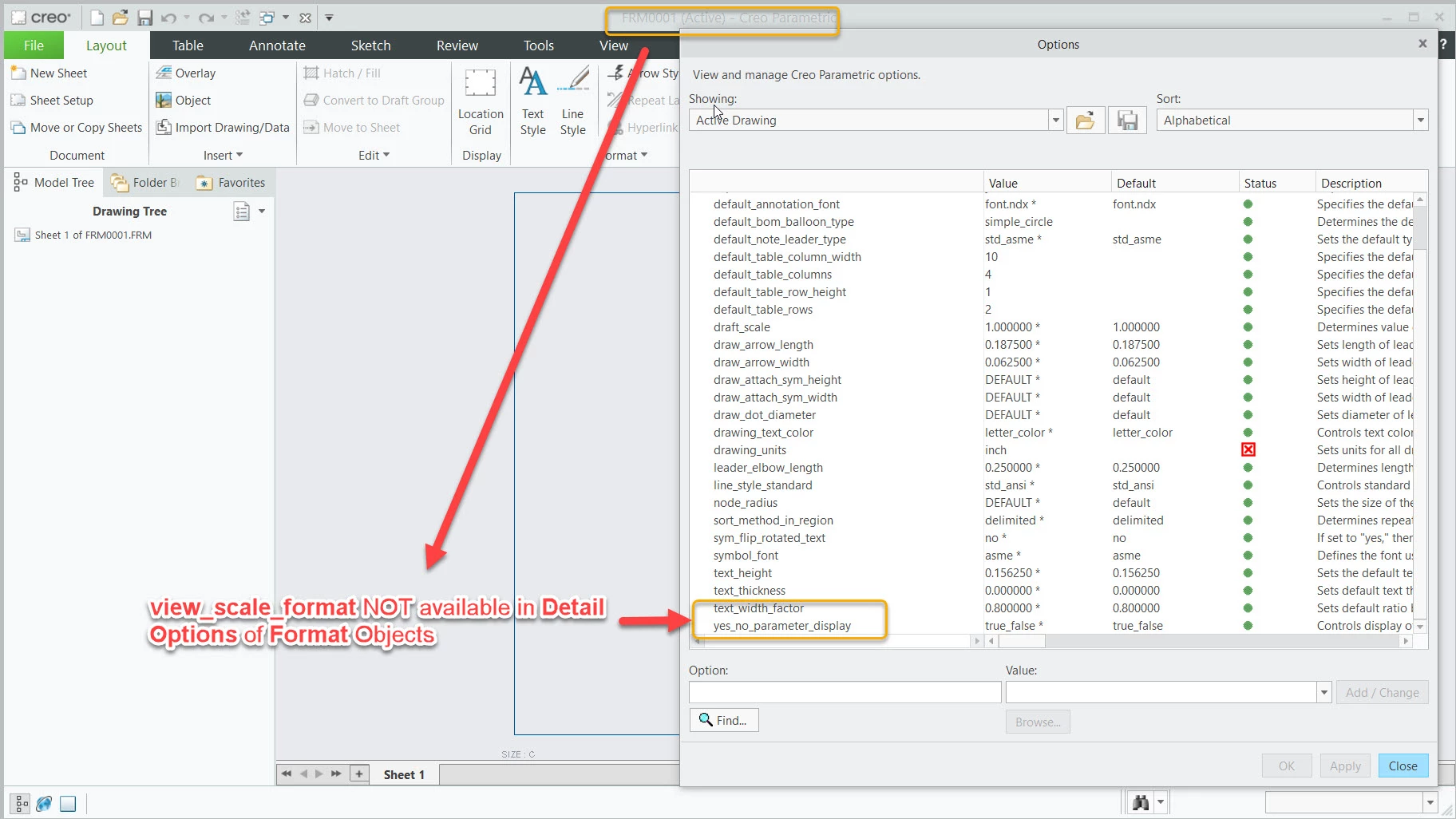 Our config.pro has view_scale_format ratio_colon (1:1) which does not seem to be mapping across correctly