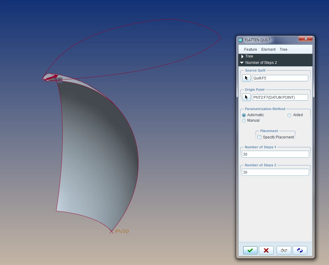 Pro/E will only unbend 'ruled' surfaces, which means that the surface can only bend in one direction. If the part/surface has curvature in two directions, it is called non-ruled geometry and Pro/E won't unbend it unless you tell it where it can stretch. The problem is that when you do that the flat pattern can be pretty different from what you might expect since it will actually add material to the part. Pro/E does not account for material thinning and stretching during the forming process - it assumes it is always a constant thickness.