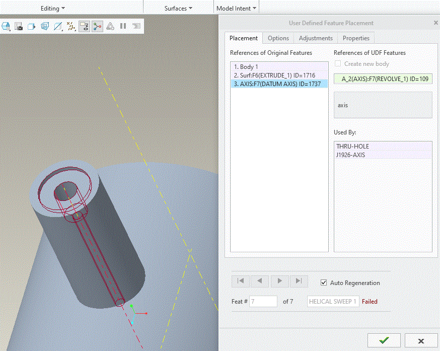 When I run the UDF on other locations, the revolves and extrudes 'flip' and do not follow the way they were created. Using the hole command, I have been able to create the spotface, drill depth, etc without any issues. When I run the UDF, the helical sweep cut (thread) of the feature flips. I have created other UDFs of this same feature and all appear to work correctly. Any ideas of what I am doing wrong?