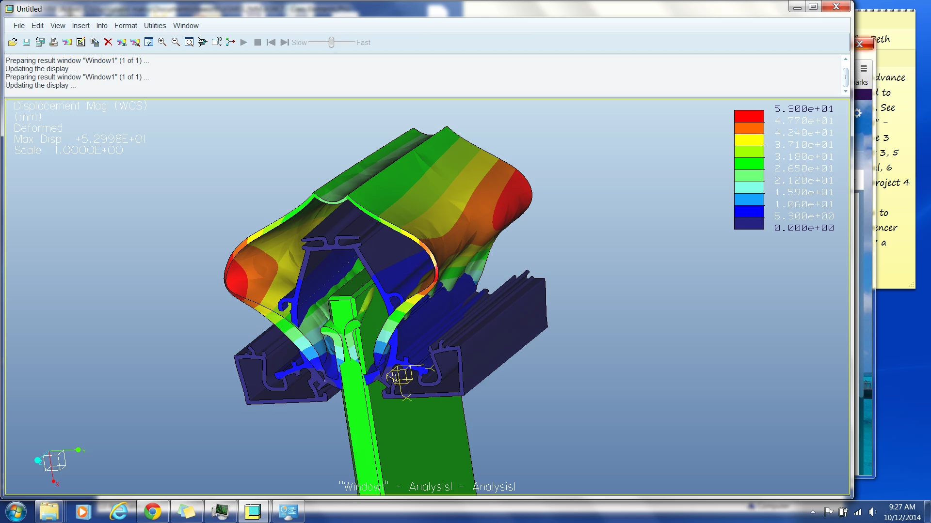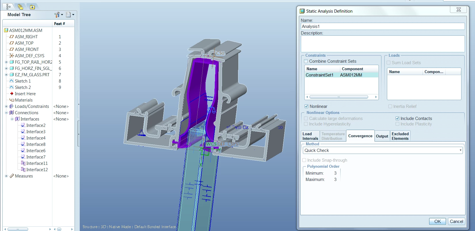2) Polypropylene seal (second part in model tree) Note this part should deflect as part 3 (glass) passes by the seal. There are 2 area I am investigating. The polypropylene part has an hour glass or a pinch in area that should deform. This is my problem, how to set up simluation to get deflection of polypropylene).