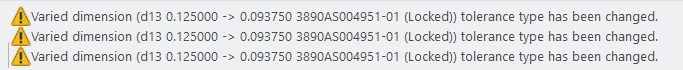 Does any one understand the warnings I get when I open a shared assembly? By that - I mean - anyone could have done it. See attached. I understand it is a flexible model. It is .125 originally. It was added as a flex comp. at .093. I ton't know what it means by tol changed? Locked? It's just annoying to keep seeing this warning. I assume something needs fixing?