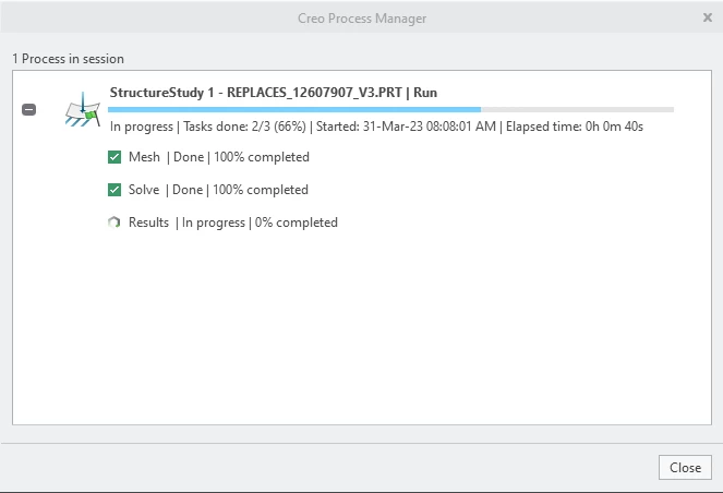 I'm running a Structure Study in Creo Ansys and it will complete the Mesh and Solve, but will not complete the Results. It is stuck at 0%. Does anyone have a detailed solution of how to fix this issue that they are willing to share?
