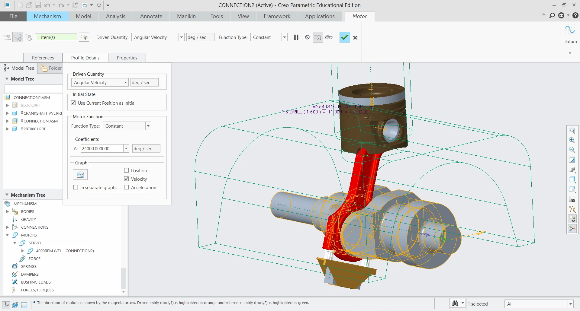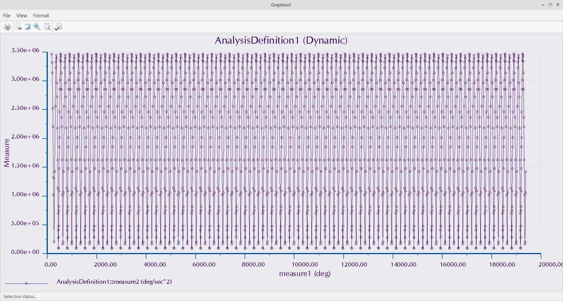 I have been working on a project of analyzing (dynamic mechanism) the angular acceleration of a piston and crankshaft mechanism. I have kept the servo motor to 24000 deg/ sec constant in angular velocity, since I need it for 4000 rpm. I ran it with desired co-ordinates and axis, but I get a varying angular acceleration which is absurd. I don't understand where I am going wrong and would be really glad if someone can help me out in this regard! I have attached the files with this thread FYI. Kindly help me people! 🙂
