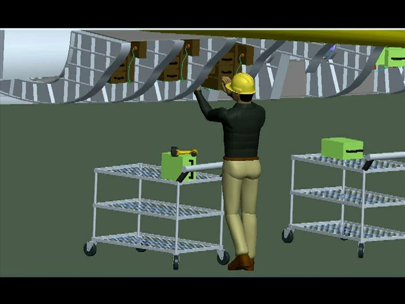 This is a more complete animation where we simulate an operator removing a radio control unit under a fighter aircraft. We can see the manikin looking, reaching and disconnecting cables. Also moving the radio control unit down to a proper height and then reachning with a tool.