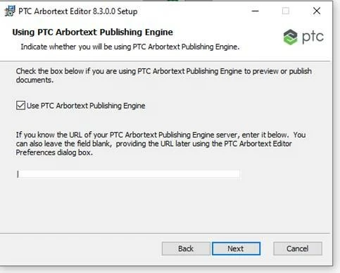 However, you can uncheck this option (if you want) while installing Arbortext Editor and this URL can be provided later if you want to connect Arbortext Editor to Publishing Engine (refer the article shared above).