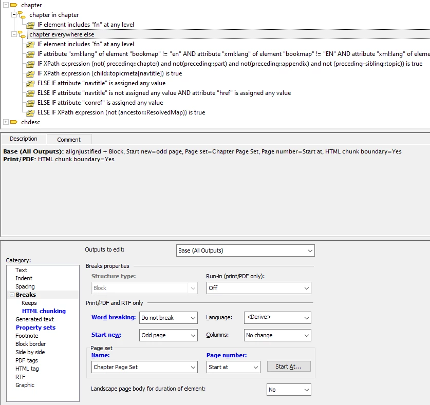 I need each chapter in my document to start on the right-hand side. In my stylesheet, on the chapter element, on the Breaks tab, I have set "Start new" to "Odd page". This works for every chapter except the very first. I am using this stylesheet with bookmaps which include frontmatter before the first chapter. I experience the same behaviour across different bookmaps.