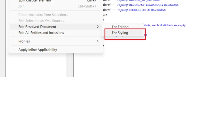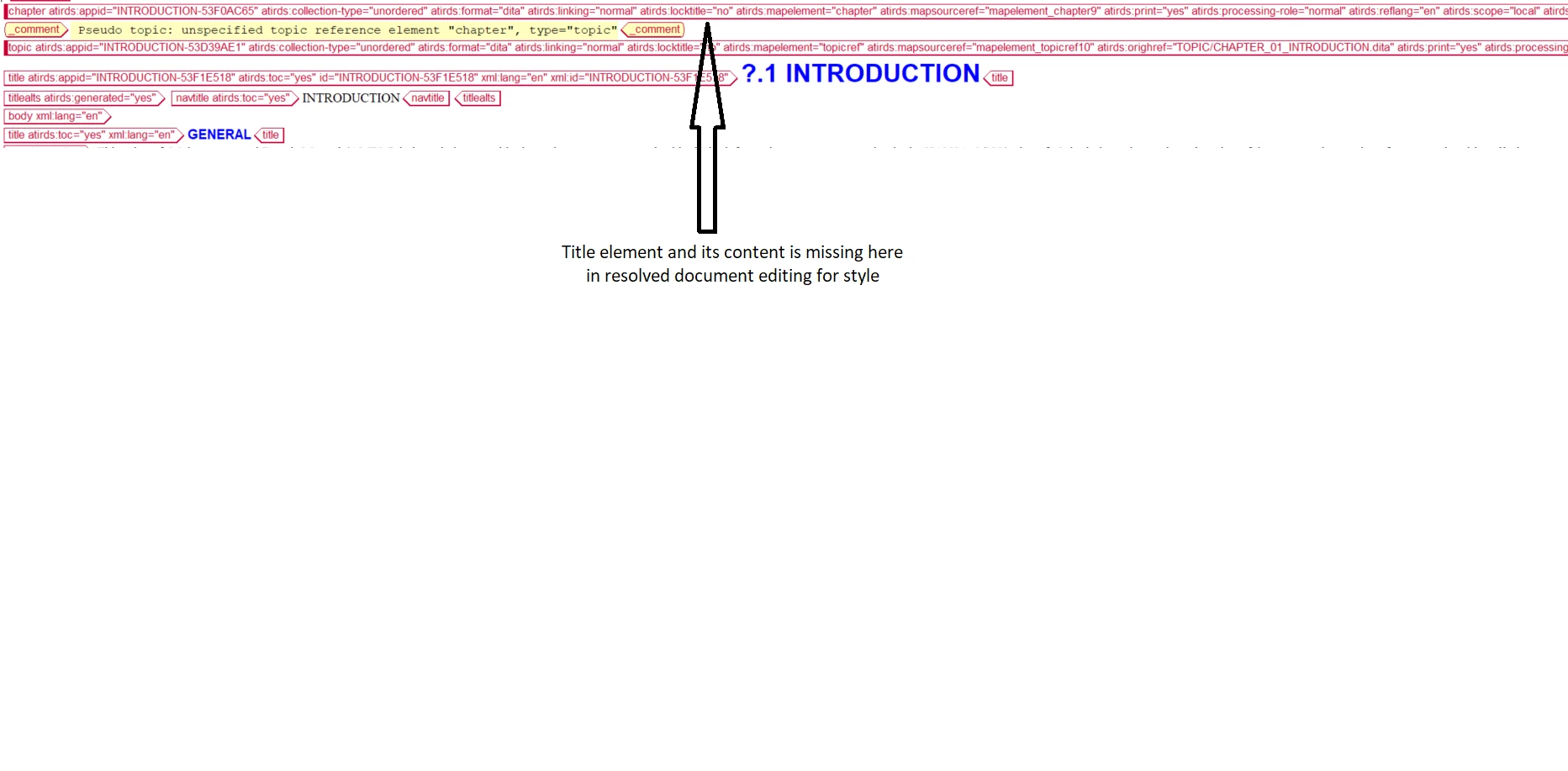 I am working on DITA Bookmap. I am having a chapter element containing title element with content (out of context rule) and Topic ref element (Topic refered locally [.dita file]) Ref Image 1.png. On Bookmap the Title element mentioned here is visible, but when I edit the document for styling [(i.e) Edit > Edit Resolved Document> For Styling] Ref Image 2.png and on the new window title element mentioned is not visible ref Image 3.png and so I am not able to format that element.