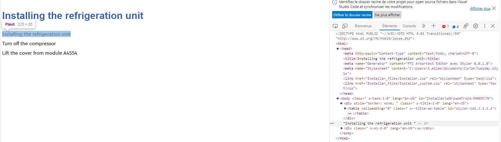 When generating output from a very basic DITA document using a stylesheet with minimal changes, the content of the top-level 'title' element is repeated with a basic text style in the following line of the PDF document and repeated without any tags in the HTML page (see images). This does not occur when using the default stylesheet for DITA. I have looked through the stylesheet parameters, especially ‘Generated text’, without finding anything that might cause this.