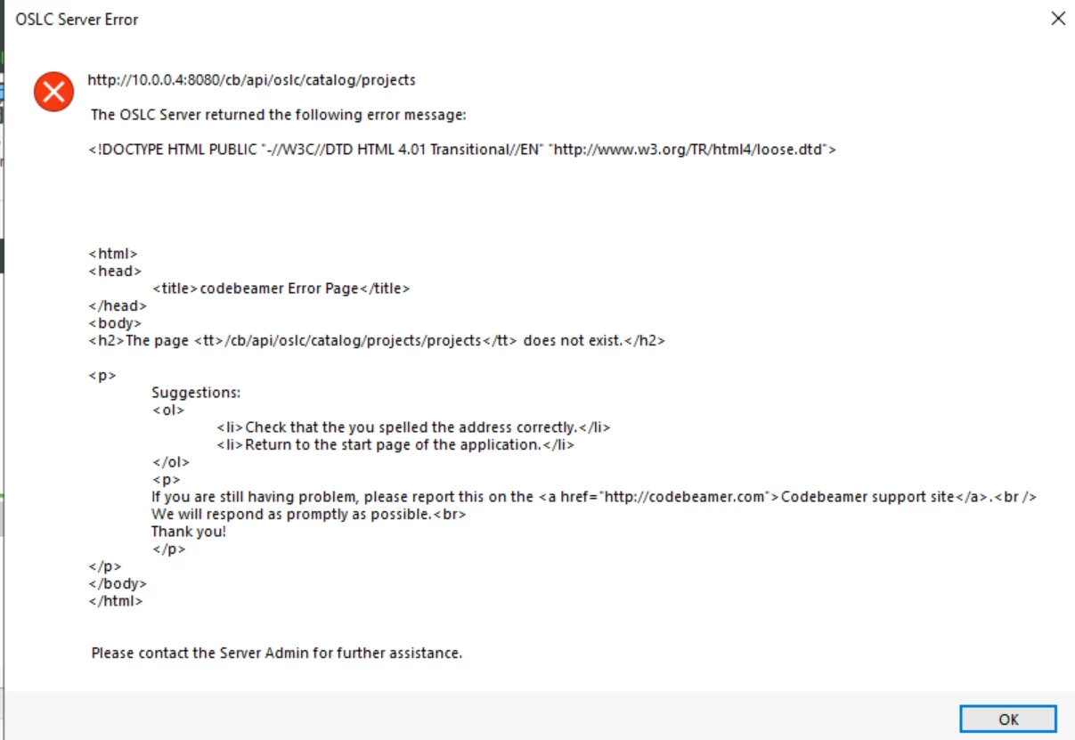 I am trying to create Codebeamer OSLC server in Windchill Modeler but facing this error - Unable to connect to the remote server but when checking the properties of the connection it shows Connected.