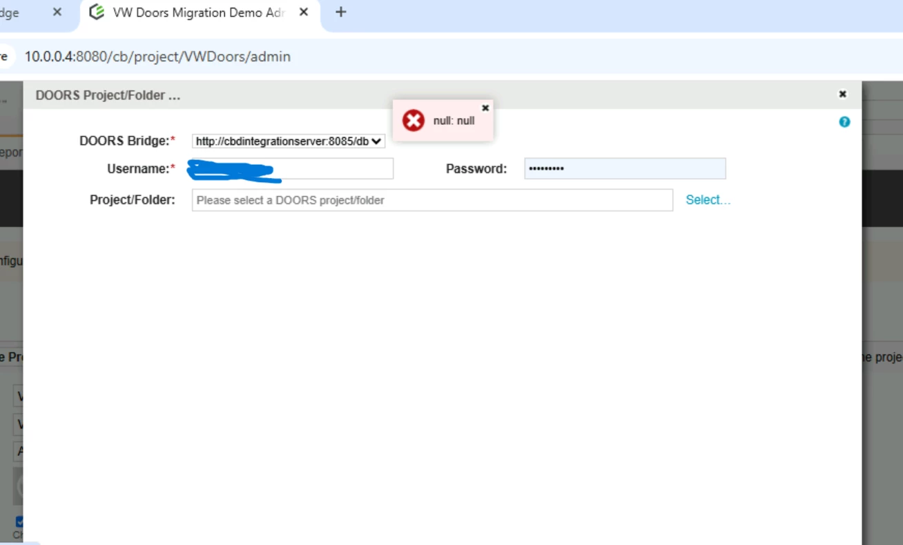 I Installed Doors bridge 1.7 version build 70. I am able to be accessing all Doors bridge rest API's but by using Doors bridge URL In the Doors Bridge GUI I am trying to configure Codebeamer Project to Doors project/Folder it giving as error message code null: null . Below I attached the error snap How fix this issue I need to integrate the Codebeamer to Doors.