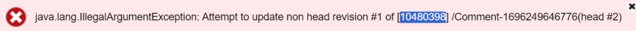"java.lang.IllegalArgumentException: Attempt to update non head revision #1 of [10480398] /Comment-1696249646776(head #2)"