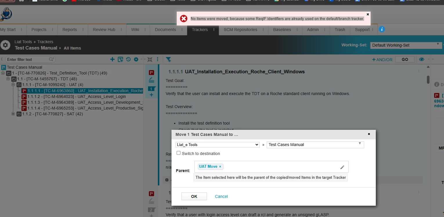 "No items were moved, because some ReqIF identifiers are already used on the default/branch tracker."
