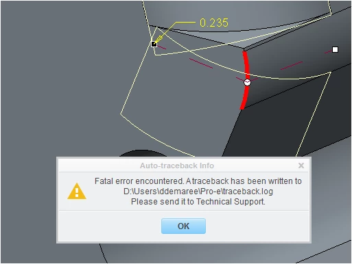 Dddemaree1-VisitorForum|Forum|11 years agoSeptember 26, 2014Questiontrace backForum|Forum|11 years agoSeptember 26, 20140 replies682 viewsAnyone ever send in one of these traceback errors to tech support?We have been on CREO 2 (m080) for a few months and have had a few of these in that time.This one happened while adding a radius.[cid:image001.png@01CFD999.7DC9BAF0]Delbert Demaree