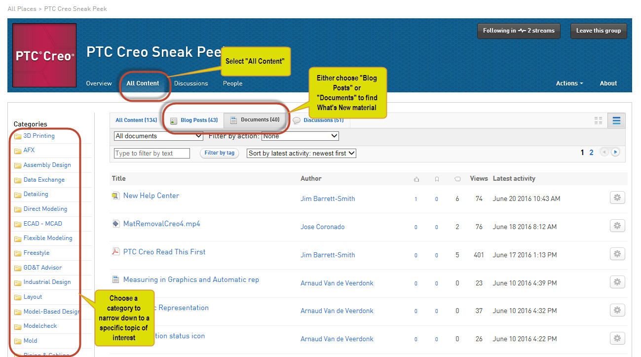 The best way to find out what's new in Creo 4.0 is to go to the "All Content" section and then choose the tabs of either "Blog Posts" or "Documents". Here you'll find the descriptions of the new stuff put there by the various Product Managers. You could also select a category on the left side to narrow down to a specific topic of interest.