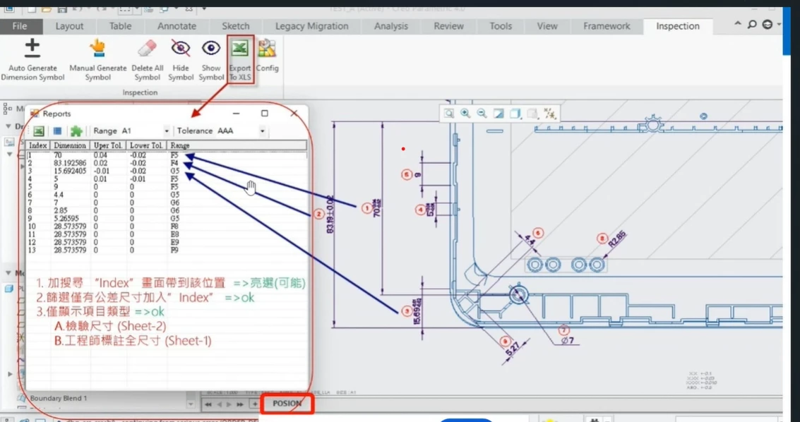 I am reaching out regarding the Creo drawing inspection function shown in the attached image. This function automatically generates a dimension report and allows for the export of dimension data to an Excel file via the "Export to XLS" button.