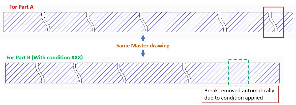 In the attachment, drawing generated for Part A from the master drawing has multiple breaks. But when drawing is generated for Part B from the same master drawing, the highlighted break is not required.