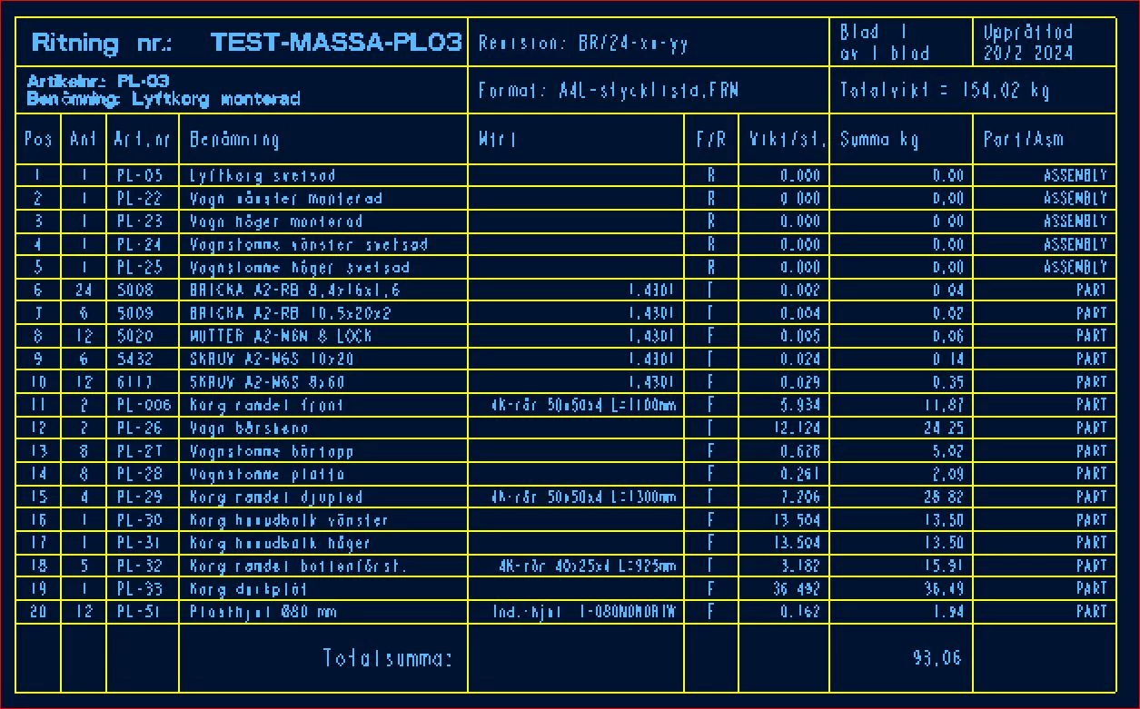 The total wight of the main assembly is calculated separately and listed in the drawing head as