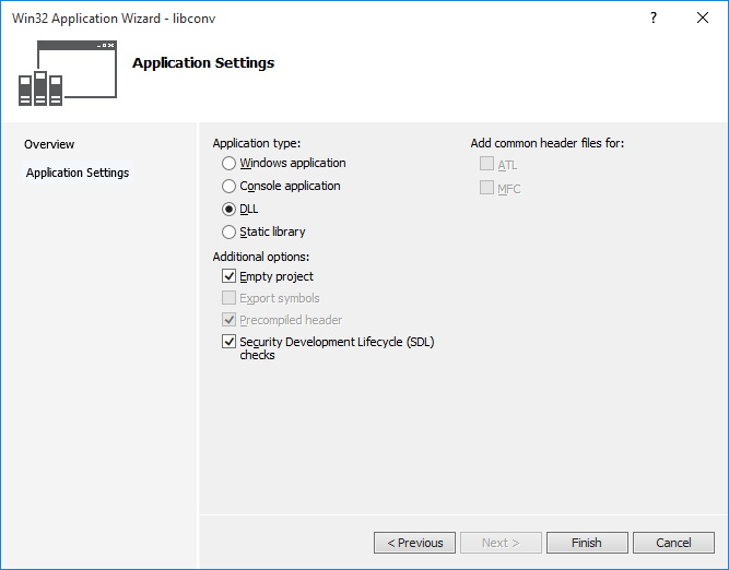 Choose DLL as the application type and check Empty Project for additional options. Click the button "Finish" to generate the new project.