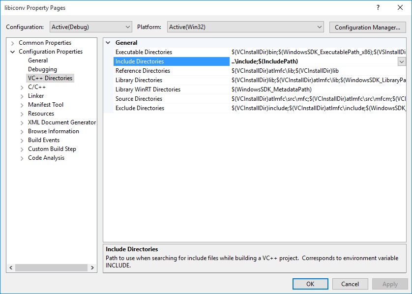 Change Include Directories as "..\include;$(IncludePath)":