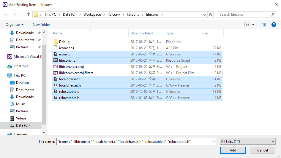 - Copy "...\libiconv-1.15\libcharset\lib\localcharset.c" to the project folder "...\libiconv\libiconv\".