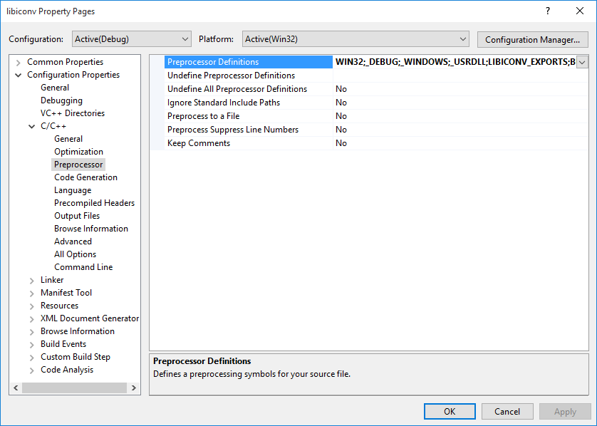 - Copy "...\libiconv-1.15\config.h.in" to the project include folder "...\libiconv\include" and then, rename the copied "config.h.in" to "config.h".