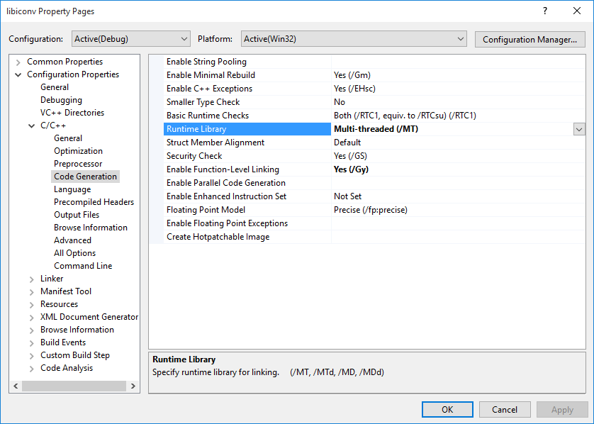 You'd better set Runtime Library to "Multi-threaded" when building dynamic link library libiconv.dll. Then, the dependency on VC Runtime library can be controlled by the applications that will be built and dynamically linked with libiconv.dll because libiconv.dll does not need VC Runtime library but only the application that uses libiconv.dll may or may not need VC Runtime library. However, when building the static link library libiconvStatic.lib, you can choose Runtime Library option for libiconvStatic.lib depending on the application that uses libiconvStatic.lib.